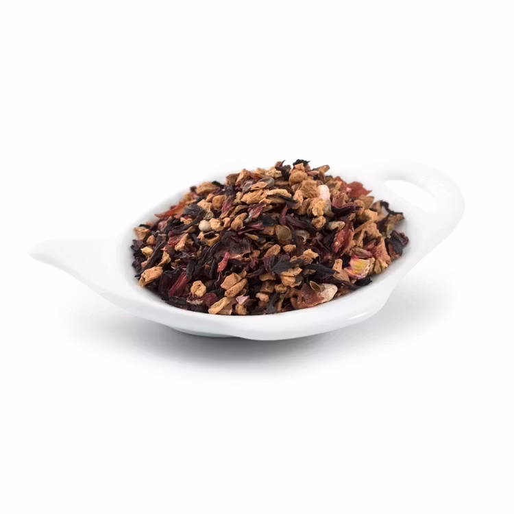 Ingredienser: Äpple, malva (hibiskus), nyponskal, citrusskal, jordgubbsarom, jordgubb, gräddarom.