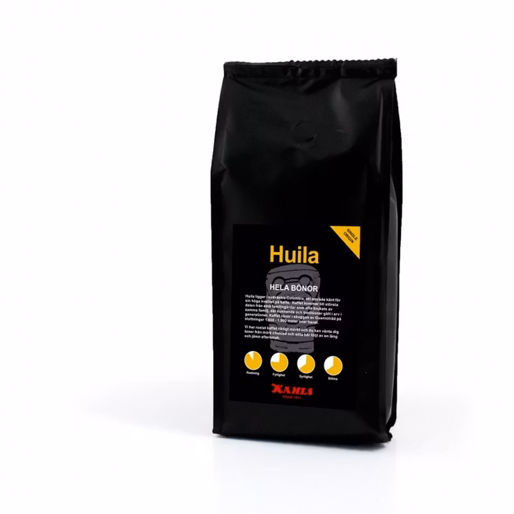 Huila i sydöstra Colombia är ett område känt för sin höga kvalitet på kaffe. Kaffet växer längs sluttningar på mellan 1 600 och 1 900 meters höjd. Har rostat kaffet riktigt mörkt och du kan vänta dig toner från mörk choklad och söta bär följt av en lång och jämn eftersmak
